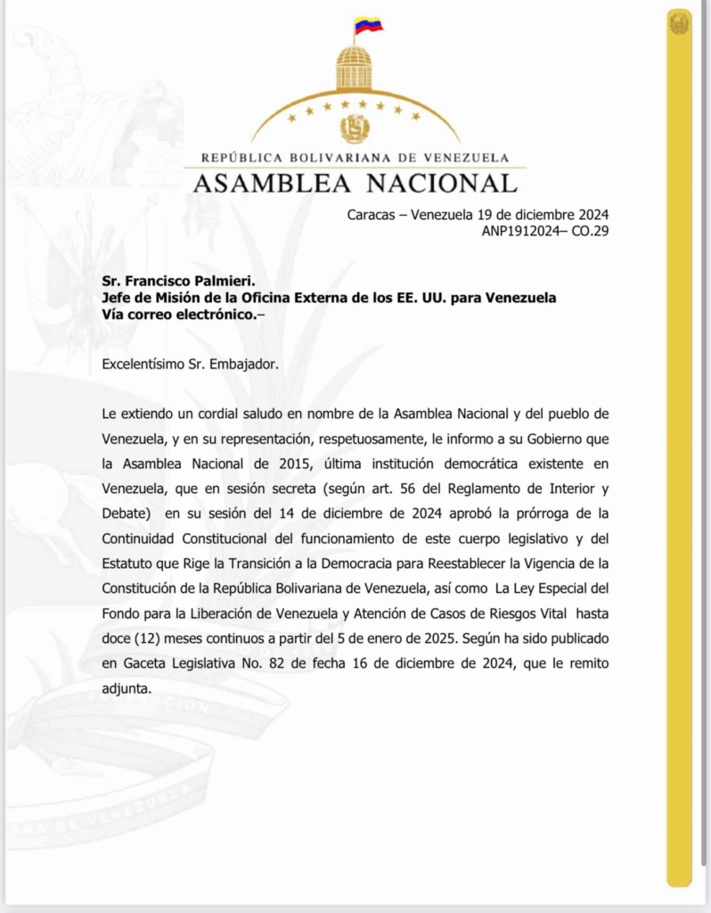 La Asamblea Nacional de 2015 anunció, mediante una carta enviada al jefe de la misión de Estados Unidos para Venezuela Francisco Palmieri, que continuará con sus funciones, aun cuando el periodo de este cuerpo colegiado habría vencido.