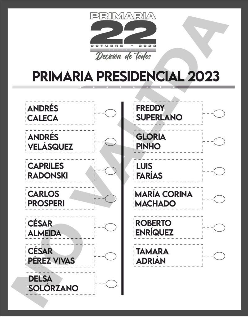 La Comisión Nacional de Primaria (CNP) publicó este 17 de septiembre la boleta electoral que se utilizará el 22 de octubre, cuando 13 aspirantes, entre candidatos y candidatas, se medirán en unas elecciones de las que saldrá el abanderado unitario de la oposición venezolana para las presidenciales de 2024.