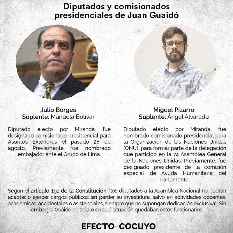 Pero, cuando a Guaidó le preguntaron en rueda de prensa este lunes, 30 de septiembre, si Pizarro y Borges perdían su investidura parlamentaria al haber aceptado estos cargos, no aclaró en qué situación quedaban estos funcionarios.