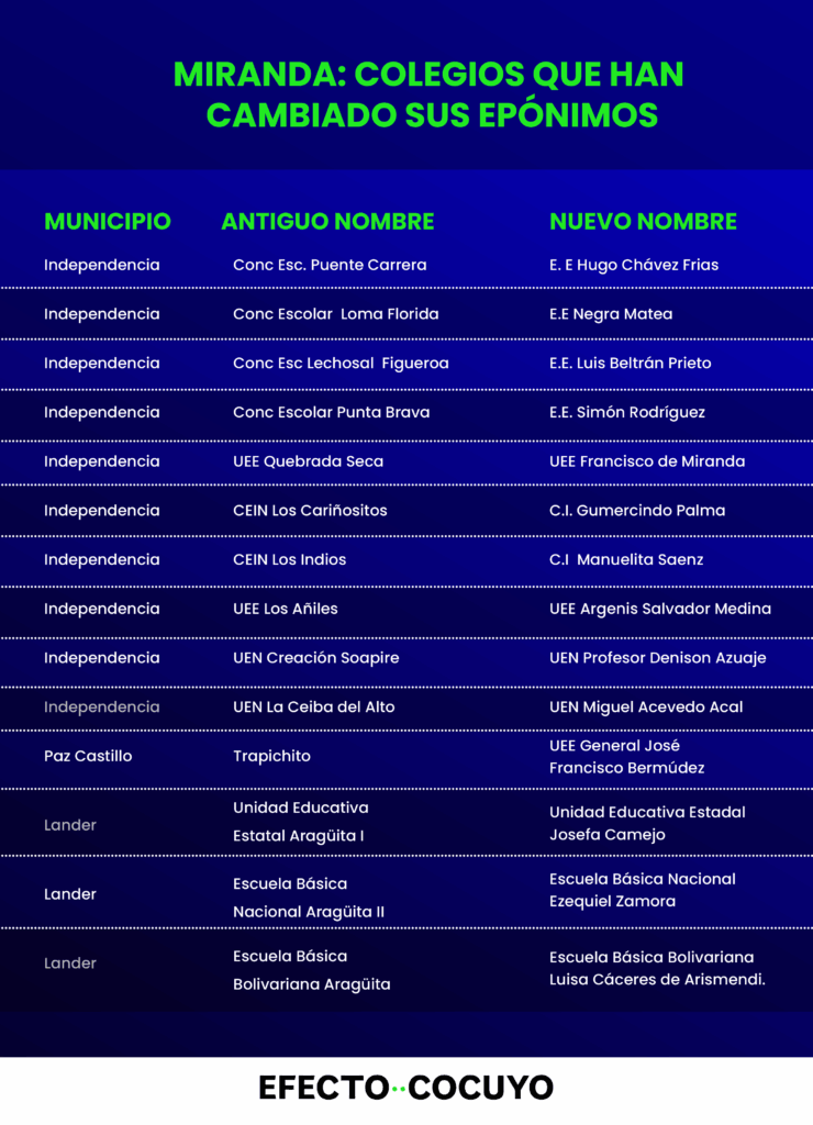 El registro completo de las 180 instituciones que cambiaron de nombre en Miranda aún se desconoce, al igual que en las demás entidades del país. No obstante, en la investigación para este reportaje se pudo identificar algunos de los recintos que tuvieron cambios.