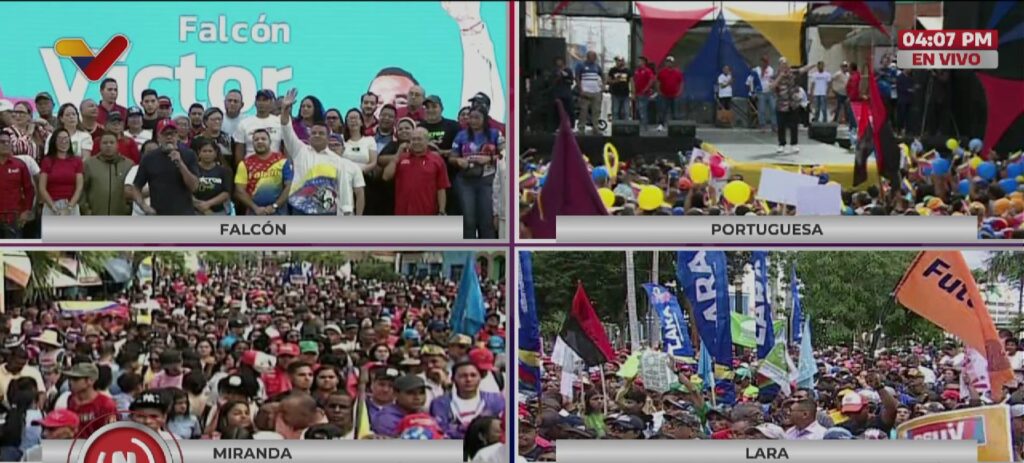 La ronda con los candidatos y los actos masivos en las regiones se repitieron este 11 de abril, cuando el Psuv presentó a sus abanderados a las gobernaciones, la representación por lista estadal a la AN y los candidatos a los Consejos Legislativos en las Juntas Regionales. El canal de la AN, ANTV, se sumó a la transmisión de VTV a lo largo de todo el día.