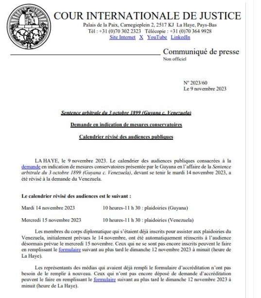 Inicialmente la Corte había citado. tanto a Guyana como a Venezuela, para el 14 de noviembre. Ahora, las audiencias se llevarán a cabo en días distintos, en el siguiente orden: a Guyana le corresponderá asistir el martes 14 de noviembre de 10 am a 11:30 am, mientras que el miércoles 15 de noviembre, en el mismo horario, será el turno de Venezuela.