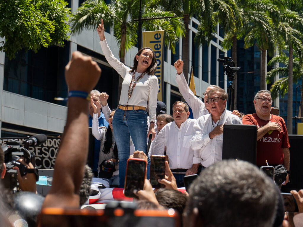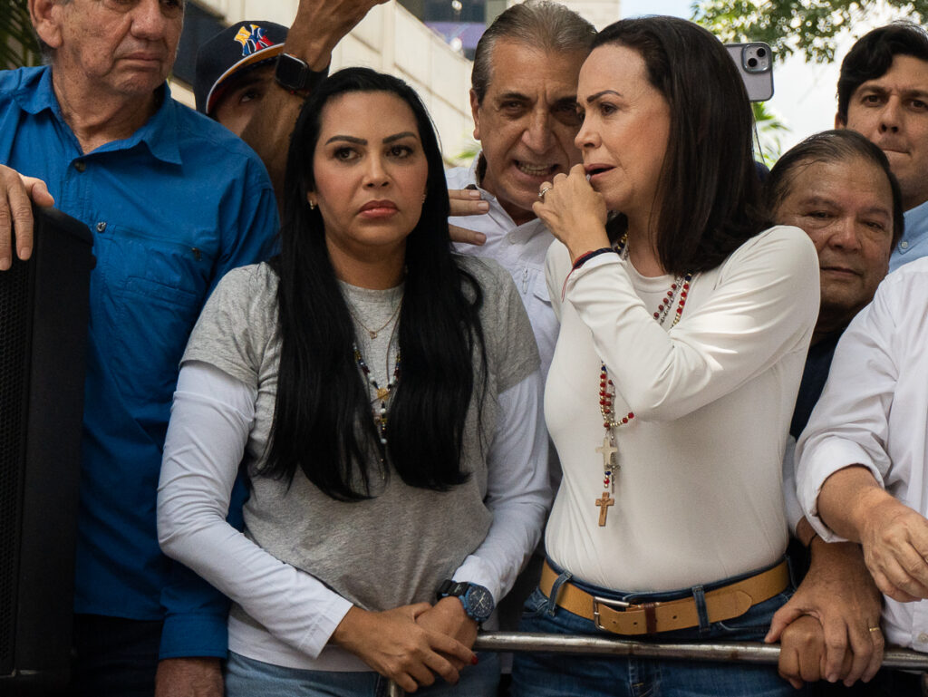 La dirigente venezolana llegó a la manifestación a bordo de un camión de carga. Estaba acompañada de Delsa Solórzano, Juan Pablo Guanipa, Andrés Velásquez y Biagio Pilieri, quien fue detenido por funcionarios de seguridad minutos después de finalizar la concentración.