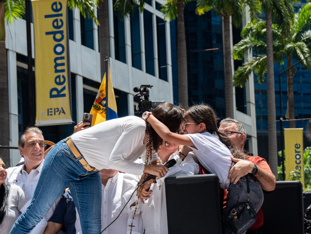 Machado avanzó entre la multitud hasta detenerse frente al centro comercial Lido y poder ofrecer su discurso. Mientras hablaba, la dirigente venezolana recibía banderas, franelas, rosarios y abrazos de las personas que estaban alrededor, especialmente de los niños.