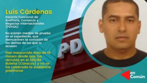 Luis Cárdenas: Gerente de Auditoría Nacional de Negocios Internacionales de Pdvsa, con 15 años en la estatal. Fue apresado en 2019, acusado de instigación al odio, odio agravado y traición a la patria, posesión ilícita de armas de fuego, ocultamiento de municiones, contrabando simple y reventa de productos.