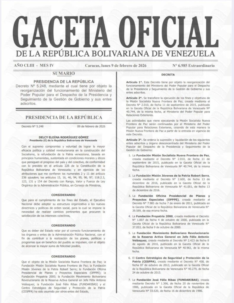 Esta decisión se suma a los cambios ministeriales que hechos por Rodríguez desde que asumió la Presidencia encargada, poco después de la captura de Maduro, y que incluyen nombramientos, modificaciones de los nombres de instituciones, la reforma de una ley petrolera y ahora también el cierre de entes públicos.