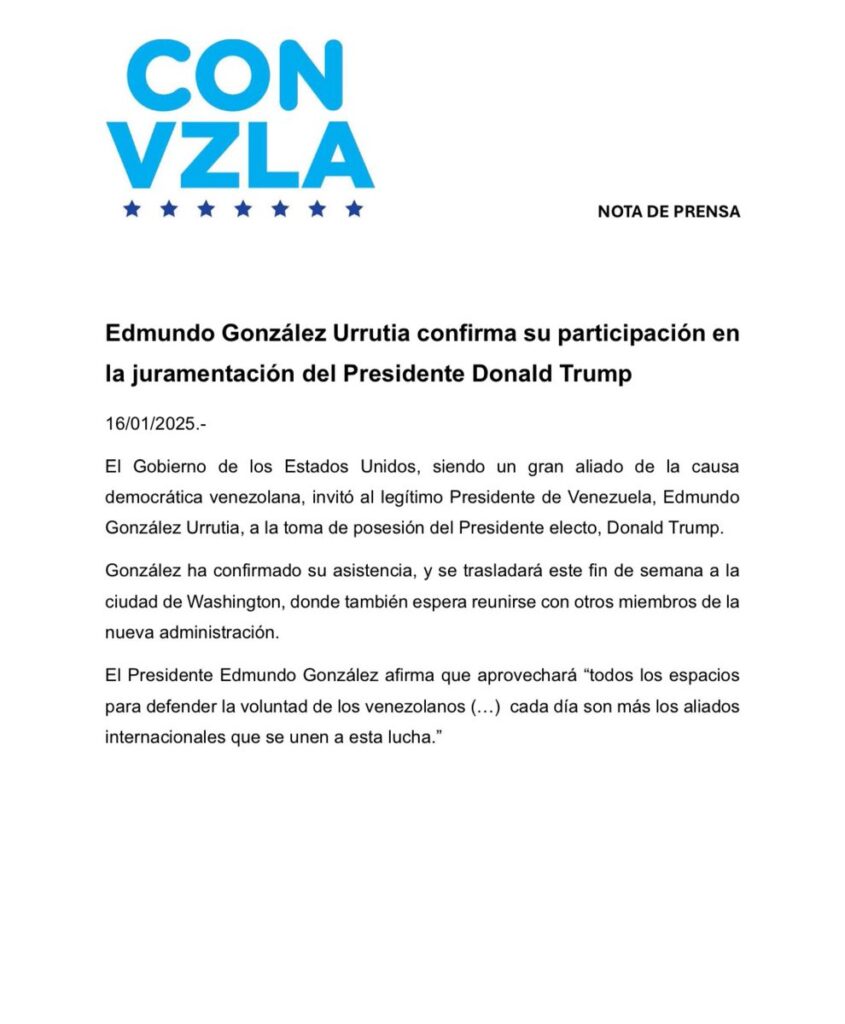 En una carta difundida por el comando Con Venezuela, se hace la confirmación de la asistencia de Edmundo González Urrutia a este importante evento donde también se reunirá con dirigentes de la política norteamericana, así como otros jefes de Estado que llegarán a la ciudad de Washington, D.C., con el objetivo de saludar a Donald Trump en su vuelta al poder.