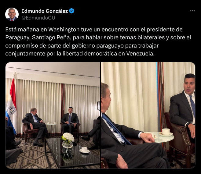 “Está mañana en Washington tuve un encuentro con el presidente de Paraguay, Santiago Peña, para hablar sobre temas bilaterales y sobre el compromiso de parte del gobierno paraguayo para trabajar conjuntamente por la libertad democrática en Venezuela”, explicó González Urrutia sobre el encuentro.