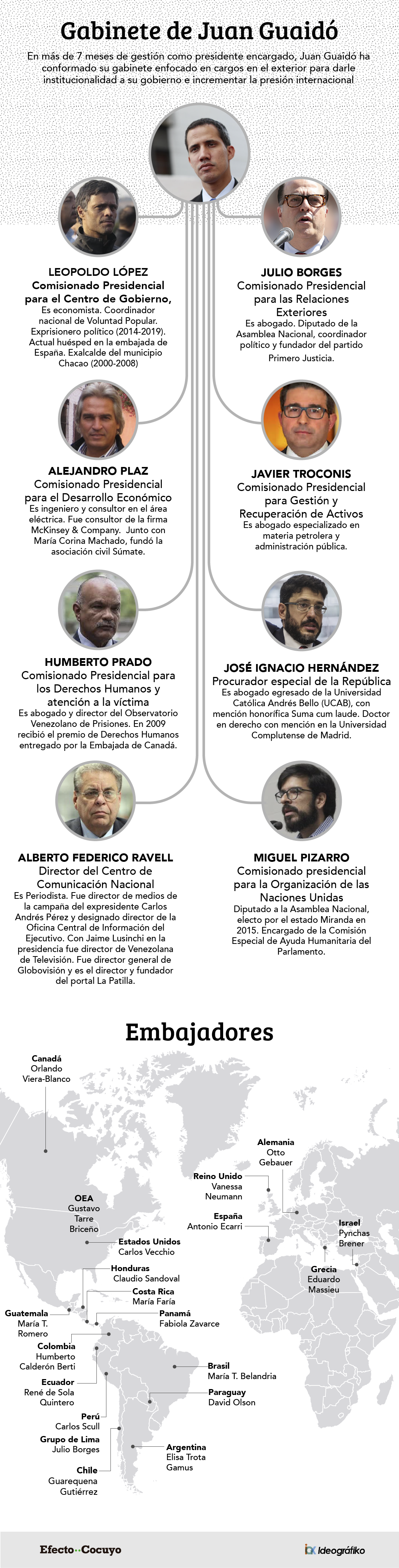 Esta mayoría de nombres de la presidencia encargada son embajadores. En total son 20 los representantes diplomáticos del gobierno de Guaidó que han sido reconocidos por los distintos países en varios continentes, principalmente en América y Europa.
