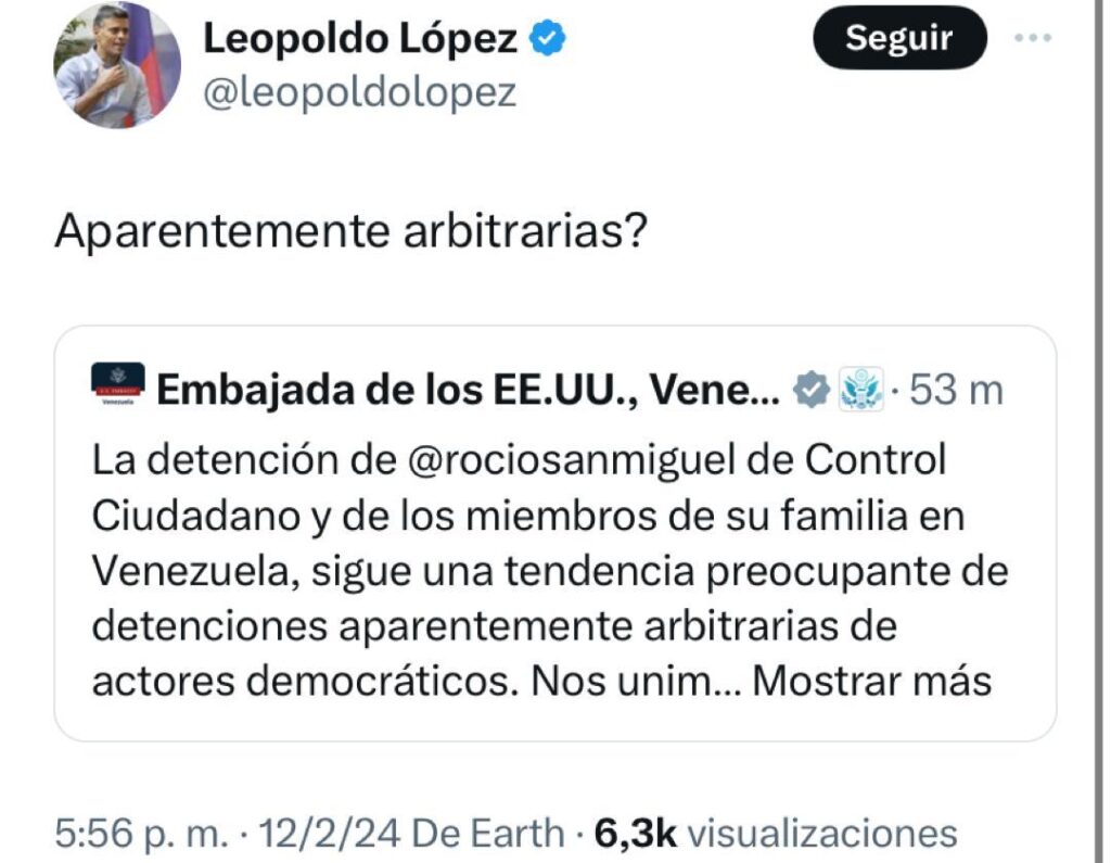 Pero la frase «aparentemente arbitrarias» del corto pronunciamiento provocó reacciones en rechazo de usuarios de la red X como el dirigente opositor exilado en España, Leopoldo López, quien repitió la frase en forma de interrogante.