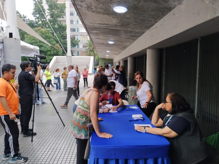 Centro de votación nucleado Las Acacias. Decenas de personas hacen filas para votar. El centro de votación aún no ha abierto porque los cotillones llegaron tarde. El candidato Carlos Prosperi arribó al lugar sobre las 9 de la mañana y espera en cola para votar.