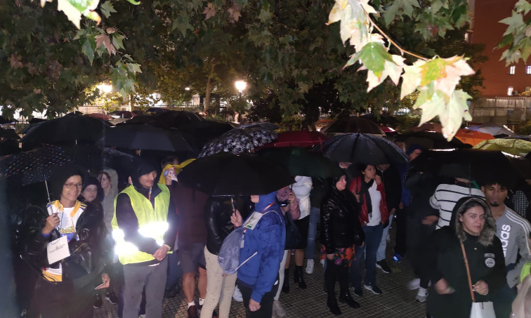 Venezolanos en Madrid continúan en cola a las 8:15 de la noche en espera para votar. Aunque llueve en la capital española y el clima está a 12° C las personas continúan esperando a ejercer su voto.