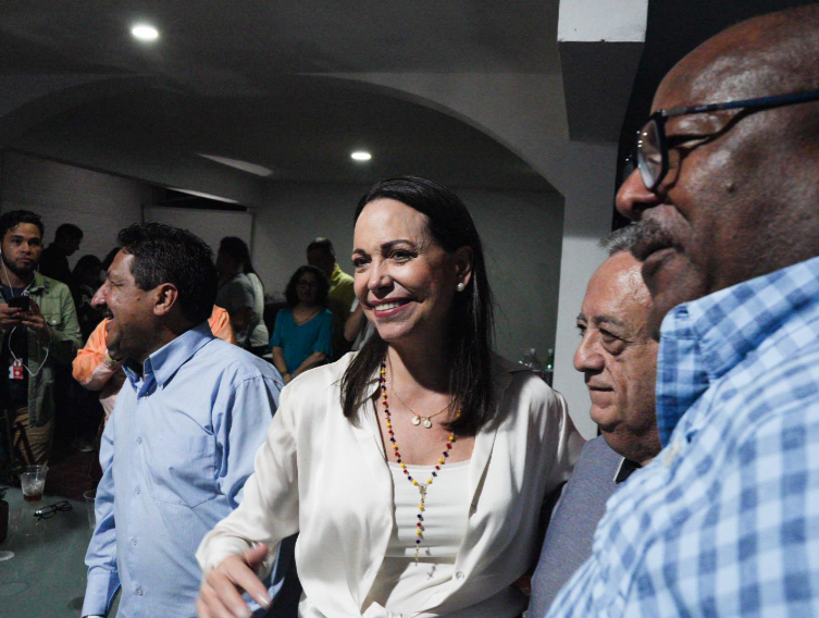 Llega María Corina Machado a Santa Eduvigis para ejercer su derecho al voto. La abanderada del partido Vente Venezuela expresó el talante cívico de la elección.