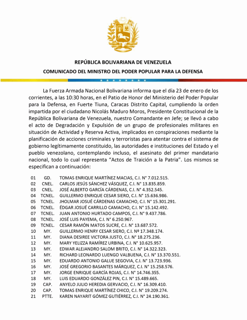 A través de un comunicado, el ministro del Poder Popular para la Defensa, Vladimir Padrino López, explicó que el acto de degradación y expulsión se llevó a cabo en el patio de honor del ministerio que encabeza, en Fuerte Tiuna, por orden de Nicolás Maduro.