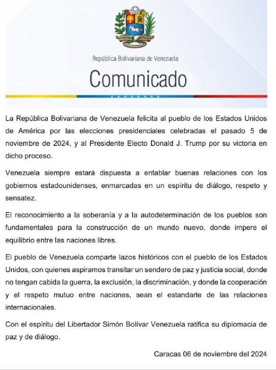 El Gobierno de Nicolás Maduro felicitó este miércoles a Donald Trump por su triunfo en las elecciones presidenciales de Estados Unidos, al tiempo que dijo que Venezuela siempre estará dispuesta a mantener «buenas relaciones con los gobiernos estadounidenses».
