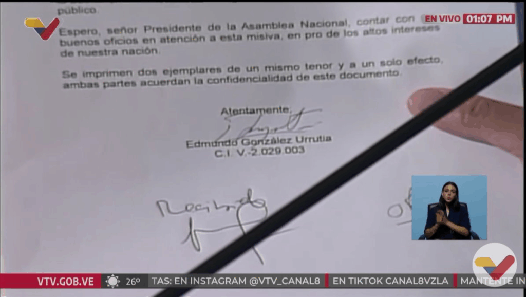 En transmisión por los medios del Estado, Rodríguez mostró la supuesta misiva firmada por González Urrutia; dijo que la rubricó en la sede de la Embajada de España en Caracas, pocas horas antes de que el exdiplomático partiera a Madrid en calidad de exiliado.