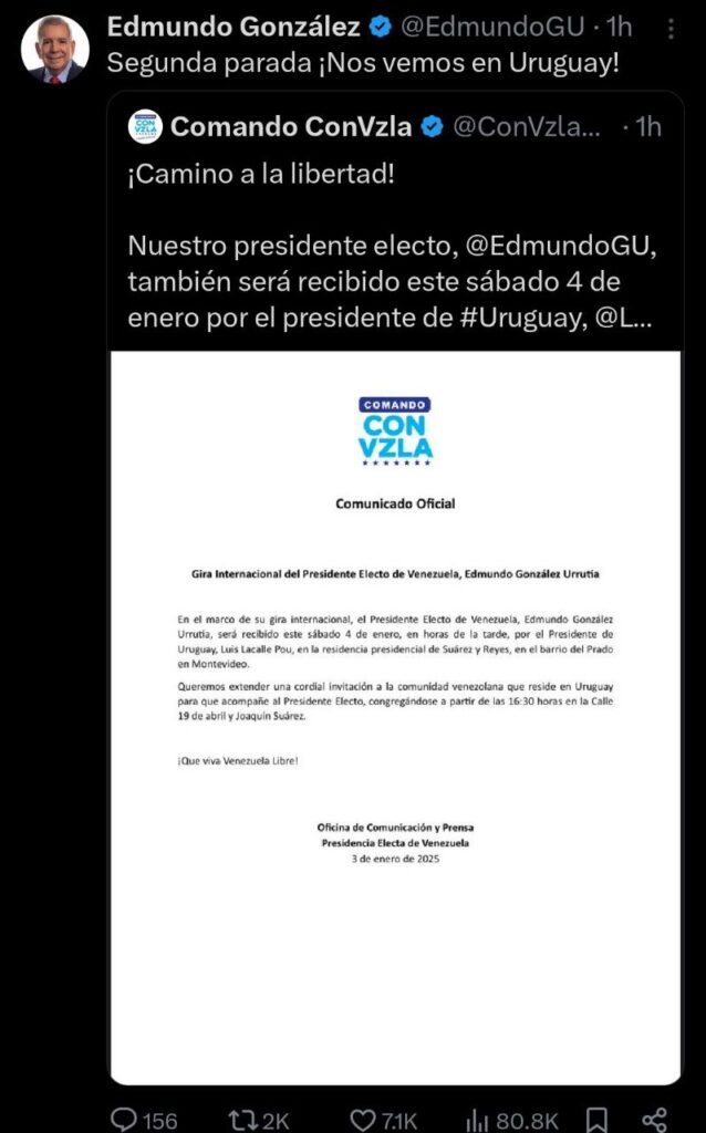 “La gira de Edmundo González por Latinoamérica será una importante operación política que busca tres cosas esencialmente: Que los líderes de la región desconozcan al gobierno de Maduro luego del 10 de enero. Que los líderes del continente presionen para que Edmundo González pueda tomar posesión del gobierno en cualquier momento del año. Alinear a los gobiernos del continente con la nueva estrategia del presidente Trump para Venezuela”, sostuvo Enderson Sequera.