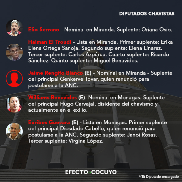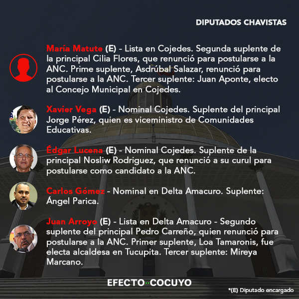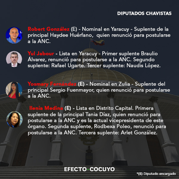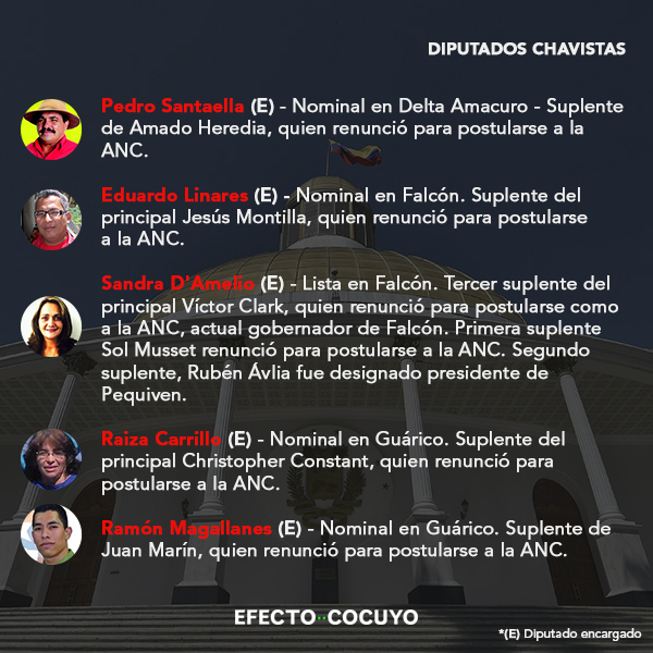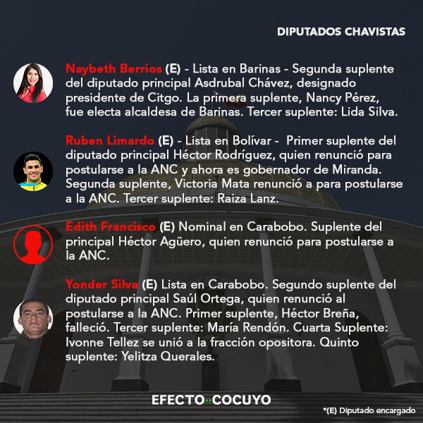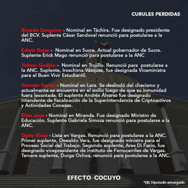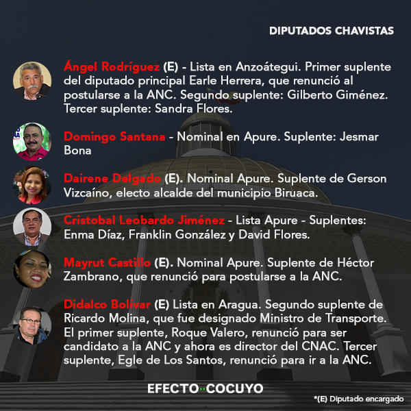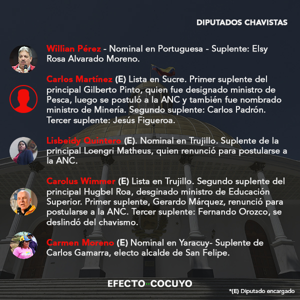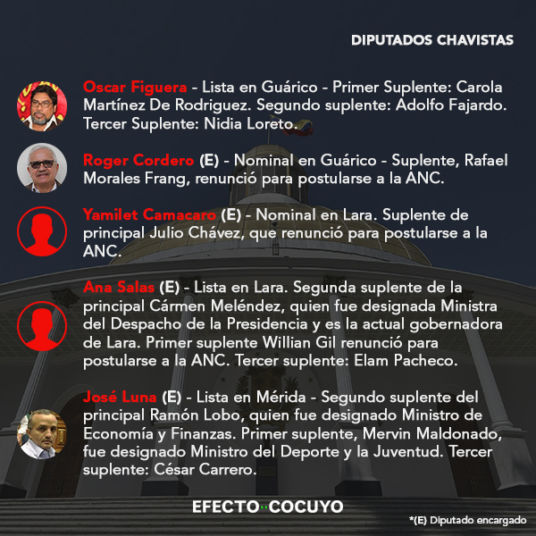De los 55 parlamentarios electos por el chavismo en 2015, 34 diputados principales habrían perdido su investidura y deberán incorporarse sus suplentes por ocupar otros cargos públicos, en su mayoría postulados a la Asamblea Nacional Constituyente (ANC).
