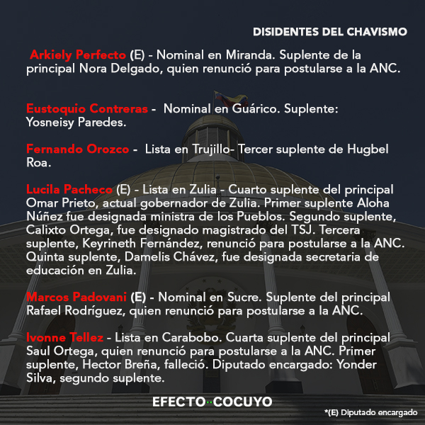Además, la bancada chavista también estaría en riesgo de perder seis de sus curules en el Parlamento Nacional. Seis de sus escaños estarían afectados por haber ejercido cargos públicos, tanto los parlamentarios principales como los suplentes. Mientras otros seis parlamentarios han disidido del chavismo.