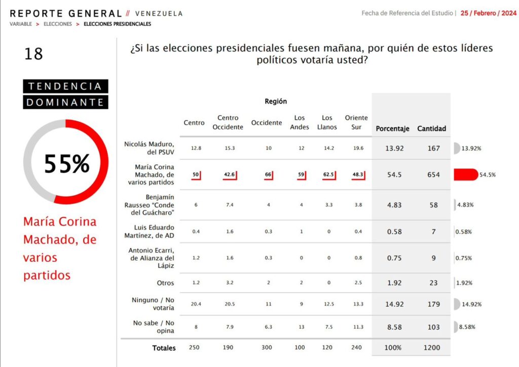 La muestra de la encuesta, con fecha 25 de febrero de 2024, fue de 1.200 electores entrevistados en Caracas, Miranda, Aragua, Carabobo, Lara, Falcón, Zulia, Mérida, Táchira, Portuguesa, Barinas, Guárico, Anzoátegui, Nueva Esparta, Sucre, Monagas y Bolívar que «conforman 90% de la población electoral de Venezuela».