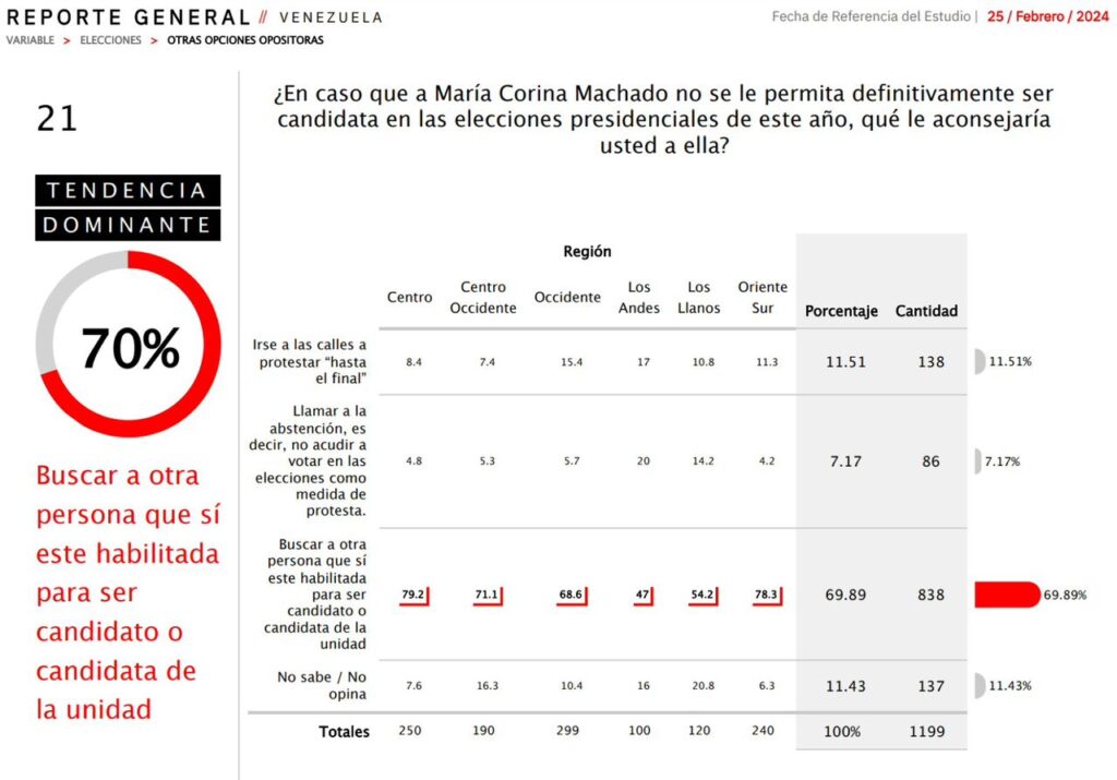 Consejo. «En caso que a María Corina Machado no se le permita definitivamente ser candidata en las elecciones presidenciales de este año», reza la encuesta, 70% de los venezolanos le aconseja: «Buscar a otra persona que sí esté habilitada para ser candidato o candidata de la unidad».