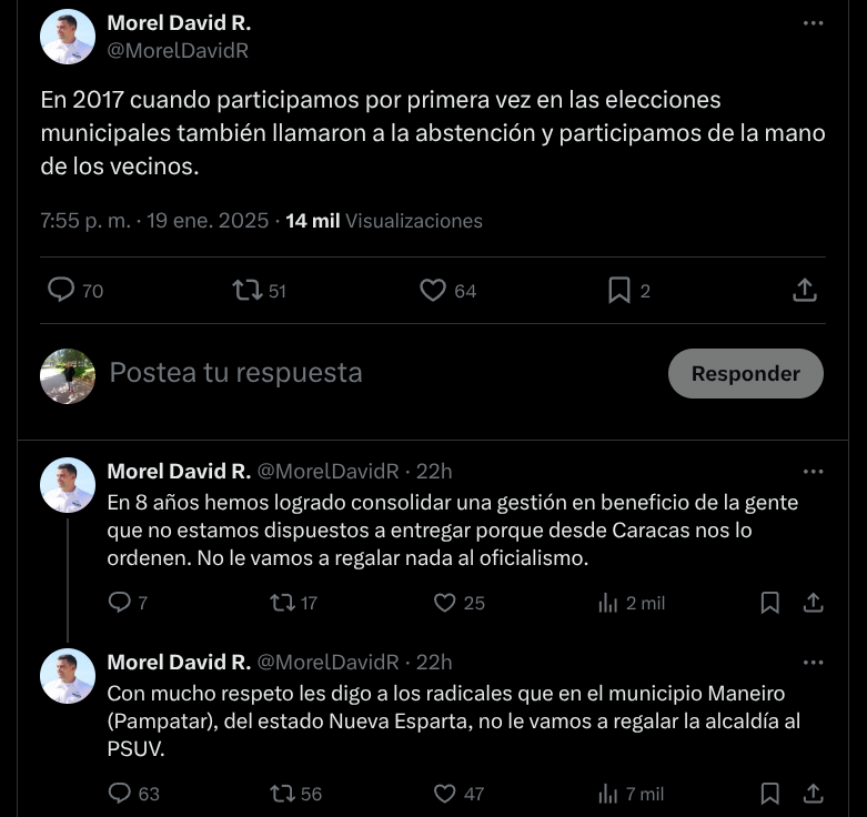 Desde Nueva Esparta, el alcalde de Pampatar,Morel David Rodríguez ha expresado su disposición a postularse nuevamente para el cargo, sin atender “órdenes de Caracas”. Considera que tiene una gestión que defender y consolidar y no le dejará el camino libre al chavismo.