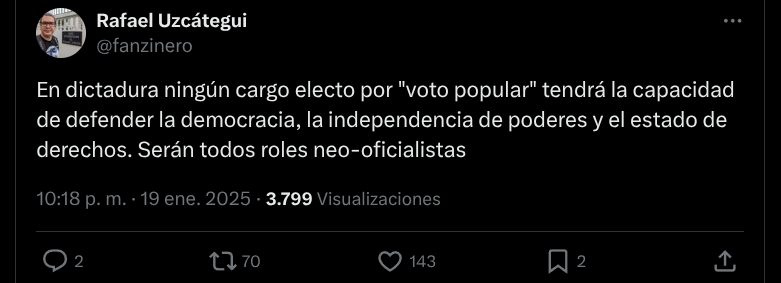 “Ya el resultado electoral no es mandatorio para el gobierno, independientemente del resultado electoral el gobierno decide si lo respeta o no. Ya no estamos en un régimen autoritario competitivo, donde el gobierno va a hacer su máximo esfuerzo por ganar las elecciones y donde puede ganarlas o puede perderlas, sino ante un régimen que ya sencillamente descartó la competencia electoral y quienes van a ocupar los cargos son los que el gobierno decida. Estamos en un régimen autoritario de corte hegemónico que no compite electoralmente, donde lo electoral ya no es vinculante”, alertó Alarcón.