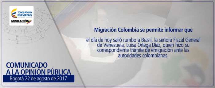 Las autoridades migratorias colombianas confirmaron este martes, 22 de agosto, que la fiscal destituida, Luisa Ortega Díaz, abandonó el país vecino para viajar a Brasil. La información fue dada a conocer por Migración Colombia a través de un comunicado publicado en su página web y se señala que la la exfuncionaria venezolana realizó los respectivos trámites para salir del país.