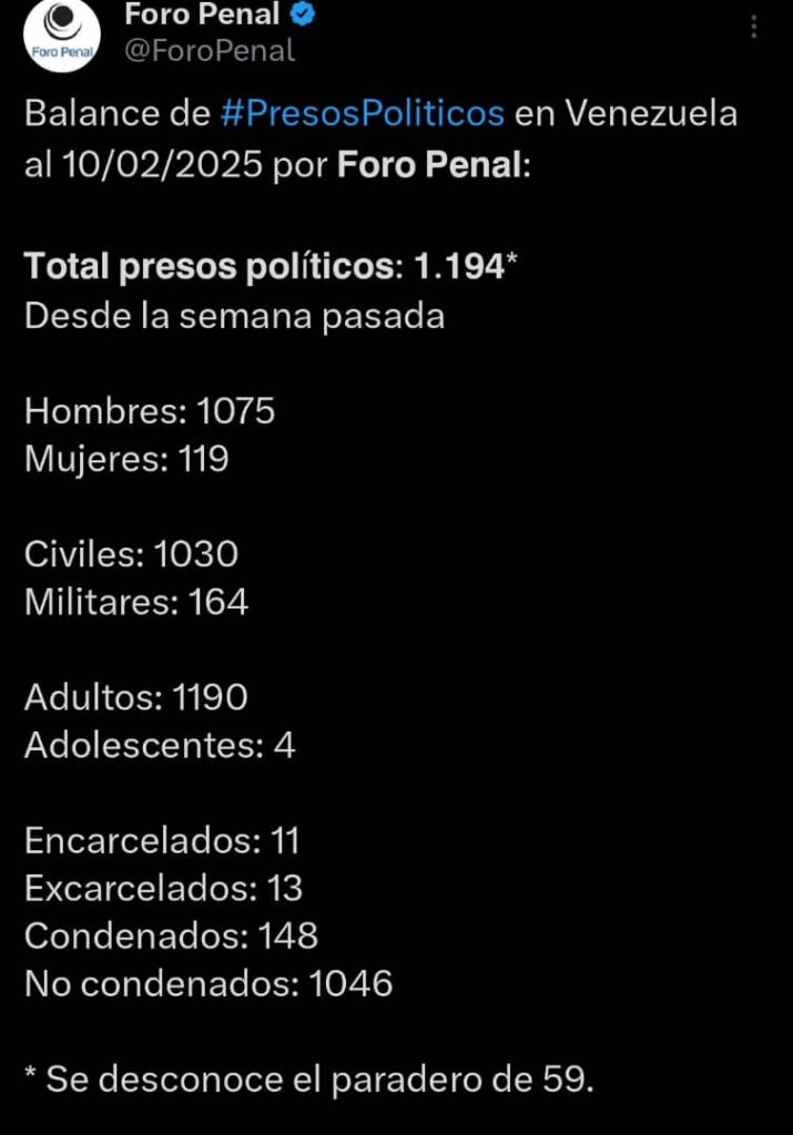 Hasta este 10 de febrero, la ONG Foro Penal registró 1.194 presos políticos en el contexto de las protestas contra los resultados electorales del 28 de julio, anunciados por el CNE a favor de Nicolás Maduro. De la cifra, 119 son mujeres, cuatro adolescentes y 1.075 hombres.