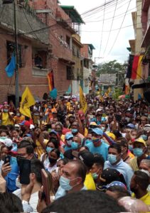 Los precandidatos, acompañados de otros dirigentes de PJ, se dirigieron a una multitud concentrada en la popular barriada. No hubo distanciamiento físico como medida de prevención contra el COVID-19. También se observó mal uso del tapabocas por parte de algunos asistentes.