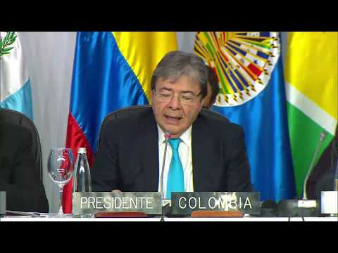 Luego de que el canciller colombiano Carlos Holmes Trujillo (electo presidente de la 49 asamblea general) aprobó el informe de credenciales de las delegaciones de los estados miembros, el representante de Bolivia pidió reconsiderar la decisión.