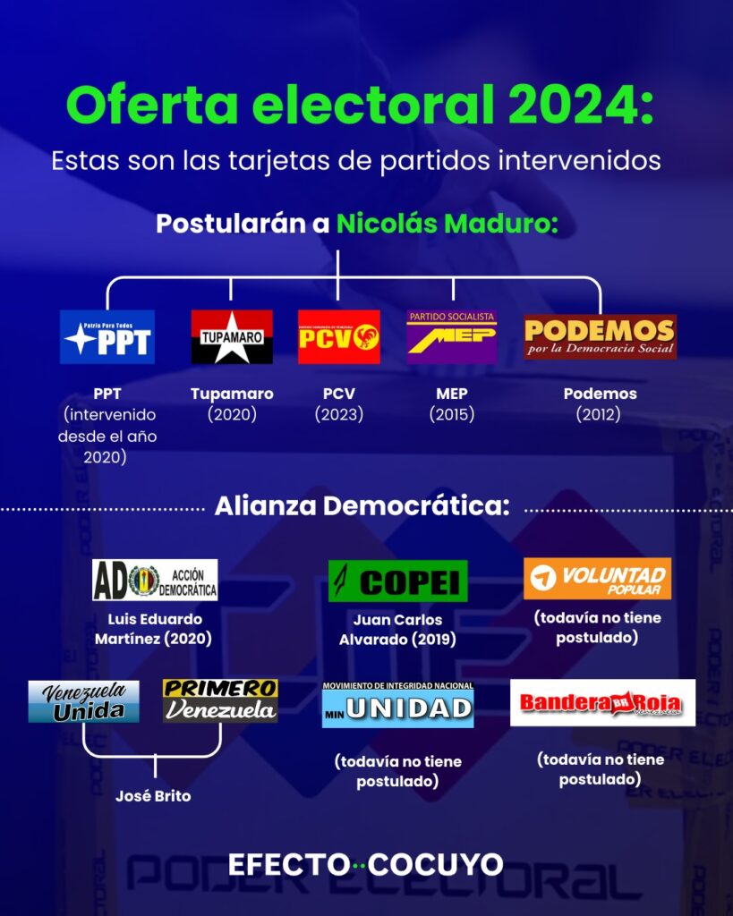 De 11 tarjetas, cinco pertenecen a partidos intervenidos por orden del Tribunal Supremo de Justicia (TSJ) entre 2012 y 2023, que trajo como consecuencia que los símbolos y tarjetas electorales fueran entregados a personas afines al gobierno nacional. Es el caso del PPT, Podemos, Tupamaro, PCV y MEP.