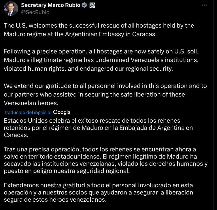 Aunque no abundan detalles de la salida de los cinco refugiados de la Embajada de Argentina en Caracas, la narrativa sobre lo ocurrido la sigue dominando la oposición encabezada por María Corina Machado, con la colaboración de Estados Unidos, frente al único alto vocero del chavismo que ha salido a hablar del tema, Diosdado Cabello.