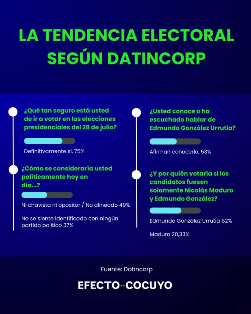 El más reciente estudio de Datincorp refleja la intención del venezolano de participar en las elecciones presidenciales del 28 de julio, con 75% de los encuestados que expresan que “definitivamente van a votar”.