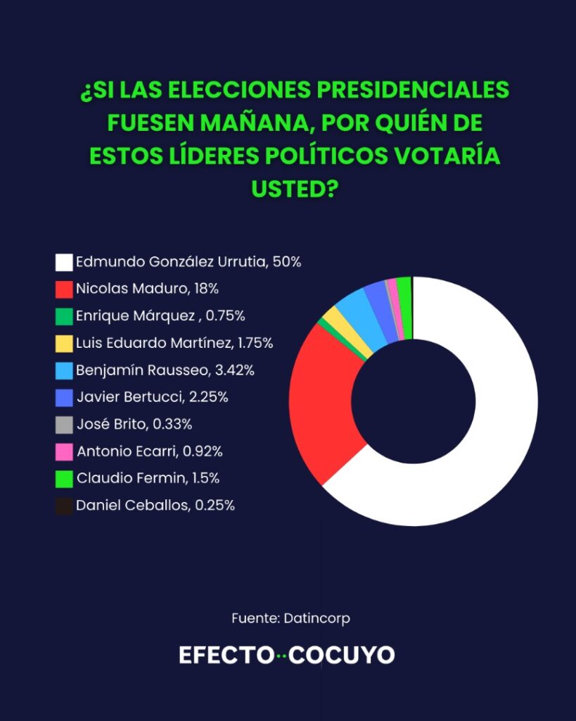 A la pregunta de por quién votaría si las elecciones fueran mañana, 50% de los encuestados respondió que por Edmundo González y por Maduro 18%. El apoyo al diplomático de carrera sube a 62% en el caso de que sólo compitan el gobernante y él en los comicios. En este caso Maduro perdería con 20,33%. Por ninguno 8,75%.