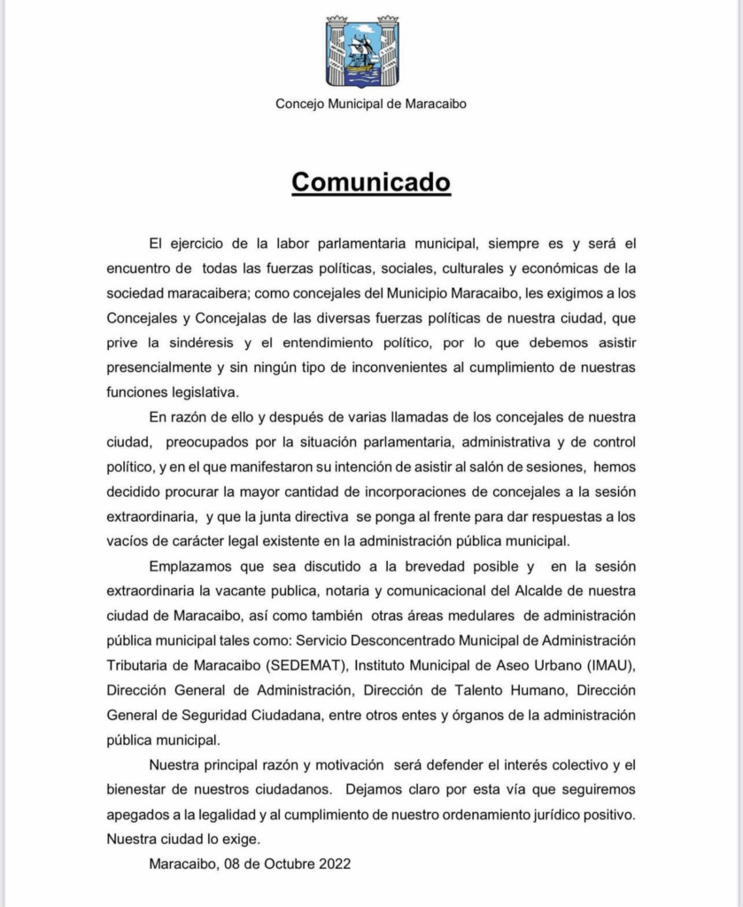 «El Sebin tendría tomada la sede del Concejo Municipal de Maracaibo y solo estarían permitiendo el acceso a los concejales del PSUV. La sesión se realizaría en el piso 7 de la sede. Pretenderían juramentar como alcaldesa Interina a la concejal del PSUV, Jessy Gascón (quien por cierto, estaría acusada de remodelar un baño de la alcaldía que costó 20 mil dólares)», denunció la abogada Bárbara Uzcátegui, asesora legal de la Alcaldía de Maracaibo.