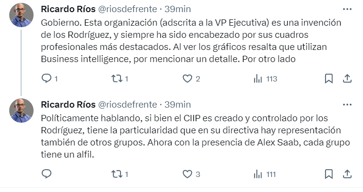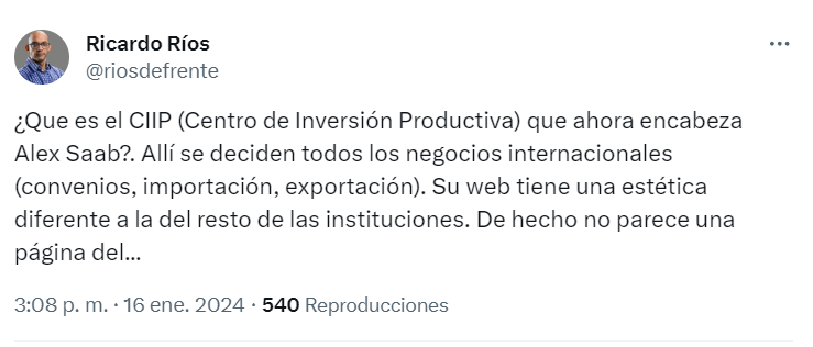 «Allí (el CIIP) se deciden todos los negocios internacionales (convenios, importación, exportación). Su web tiene una estética diferente a la del resto de las instituciones. De hecho no parece una página del gobierno», apuntó el consultor político Ricardo Ríos sobre el organismo que ahora dirige Saab, en su cuenta de la red X.
