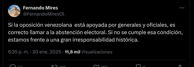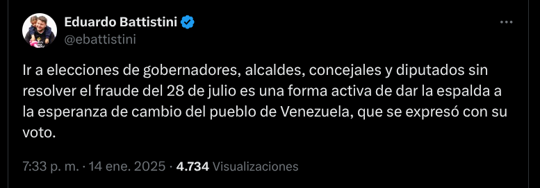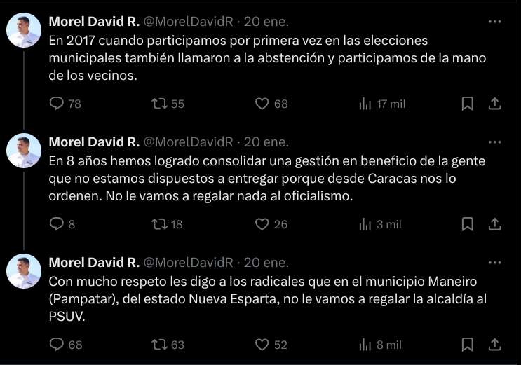 “En ocho años hemos logrado consolidar una gestión en beneficio de la gente que no estamos dispuestos a entregar porque desde Caracas nos lo ordenen. No le vamos a regalar nada al oficialismo. Con mucho respeto les digo a los radicales que en el municipio Maneiro (Pampatar), del estado Nueva Esparta, no le vamos a regalar la alcaldía al Psuv”, escribió en su cuenta de la red X, el 20 de enero.