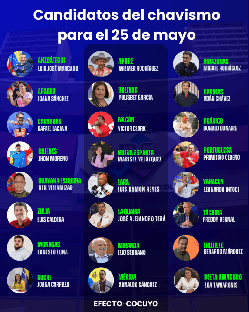 El Partido Socialista Unido de Venezuela (Psuv), en voz de su secretario general, Diosdado Cabello, dio a conocer los nombres y rostros de quiénes serán inscritos ante el Poder Electoral como candidatos a las 24 gobernaciones del país en el evento comicial fijado para el 25 de mayo.