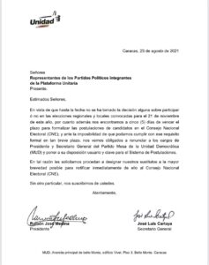 Los dirigentes emitieron una carta a los representantes de los partidos políticos que integran la plataforma unitaria, que fue difundida en las redes sociales, donde exponen que el motivo obedece a la falta de decisión sobre la participación o no en las elecciones el venido 21 de noviembre.