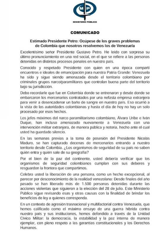 Con un mensaje en sus redes sociales, el presidente de la República, Gustavo Petro, respondió de forma rápida a la dura carta publicada por el fiscal General del régimen de Venezuela, Tarek William Saab, en la que invitaba al jefe de Estado a que se “ocupe de los graves problemas de Colombia” y que deje que las autoridades del país vecino, en este caso Nicolás Maduro, resuelva los propios; tras la petición de Petro de que se liberen los doce ciudadanos encarcelados al otro lado de la frontera.