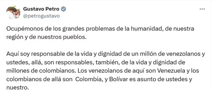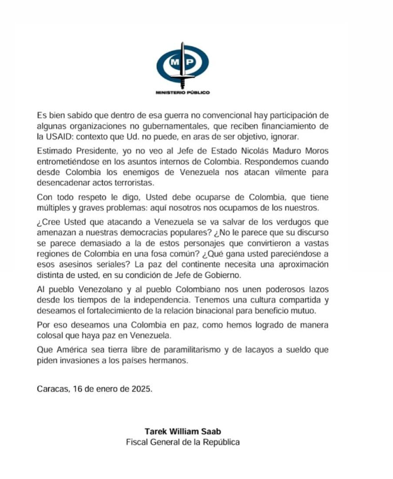 Con un mensaje publicado en la red social X, en el que replicó un artículo periodístico que hizo eco de la misiva enviada por Saab, Petro trató de bajarle la temperatura a la confrontación con el jefe del Ministerio Público venezolano y le extendió la intención de trabajar por el bienestar de los ciudadanos de ambos países, teniendo en cuenta que a lo largo de la historia se han registrado fenómenos de migración. Y recordó la lucha del libertador Simón Bolívar.