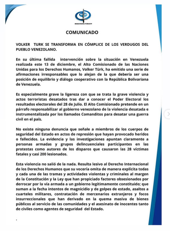 Ante el Consejo de DD. HH. de la ONU, Türk reclamó una “pronta y efectiva investigación” de, al menos, 28 asesinatos en las protestas tras los comicios, en los que el presidente Nicolás Maduro fue proclamado reelecto por el ente electoral, mientras que la oposición mayoritaria denuncia fraude y reivindica el triunfo de Edmundo González Urrutia.