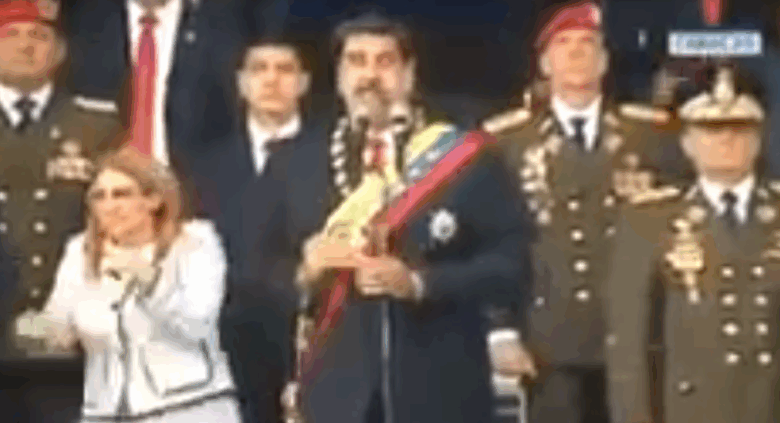 Tras la interrupción del discurso de Maduro, se ve en pantalla que Cilia Flores se estremece, se agacha un poco y se sostiene de Saab. Luego mira hacia arriba mientras se endereza nuevamente.