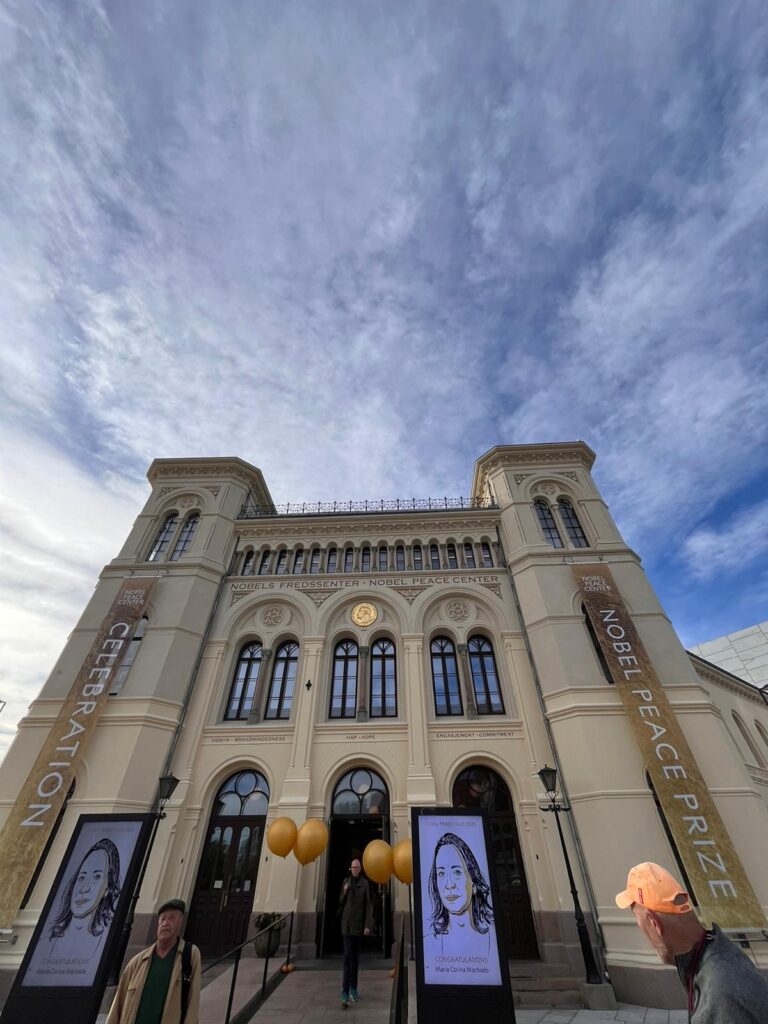 Leyenda: Mientras en Caracas los ciudadanos recibían la noticia del premio a María Corina Machado con timidez, en la sede del Premio Nobel se desplegaron afiches con su imagen (Foto Cortesía Venezolanos en Oslo)